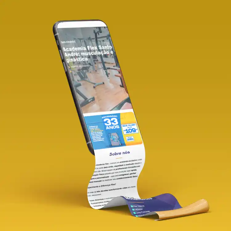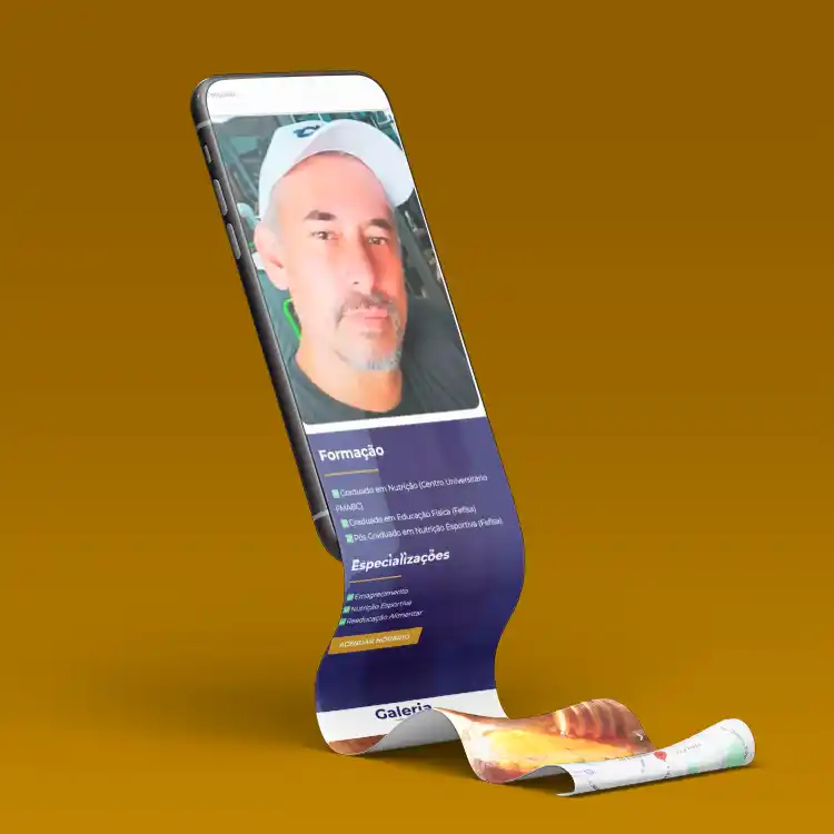 O layout de nossas páginas é padronizado para garantir uma experiência de alta qualidade. Sua página terá sempre uma aparência profissional, transmitindo confiança e seriedade, como nos exemplos da Academia Flex e do nutricionista Leandro Pontel.